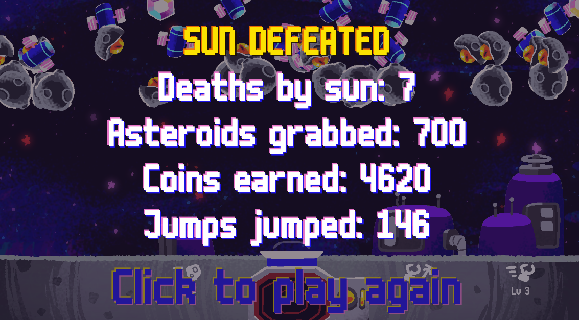It's a short and sweet game simple in its mechanics. Ideas like this work so well for a game jam because people will figure out how to play without reading instructions, there are few mechanics to learn, and the grabber is fun to use. I need to learn from you because I tend to underestimate the work required for ideas I come up with for a jam and then we run out of time right near the finish line (like this time). Finding out the grabber was able to grab more junk on its return was a cool touch. The grabber mechanic I think was implemented in such a satisfying way where you could feel it stretching out and then returning quickly. My main problem with the game was not being able to hover over the asteroids because it felt unnatural to aim so close to the robot. I know it was intentional and the range increases as you upgrade but that's just my preference and didn't negate from the experience. I would have rated this highly in the actual jam but for some reason only 1 team member can do that unfortunately. Good job!