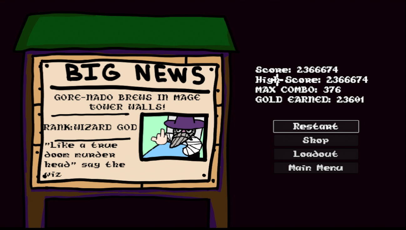 This game is very addicting. I probably played it for way longer than I should. I did not realize there were unlockable weapons while I was playing (I thought the upgrades were for WIP stuff) so I'm going to have to play it again (oh, no!). Adding an option to change your weapons in the menu after you die would probably be a good idea. Thanks for submitting, this was really fun. My high score was 597,326 (around 01:32:40),
