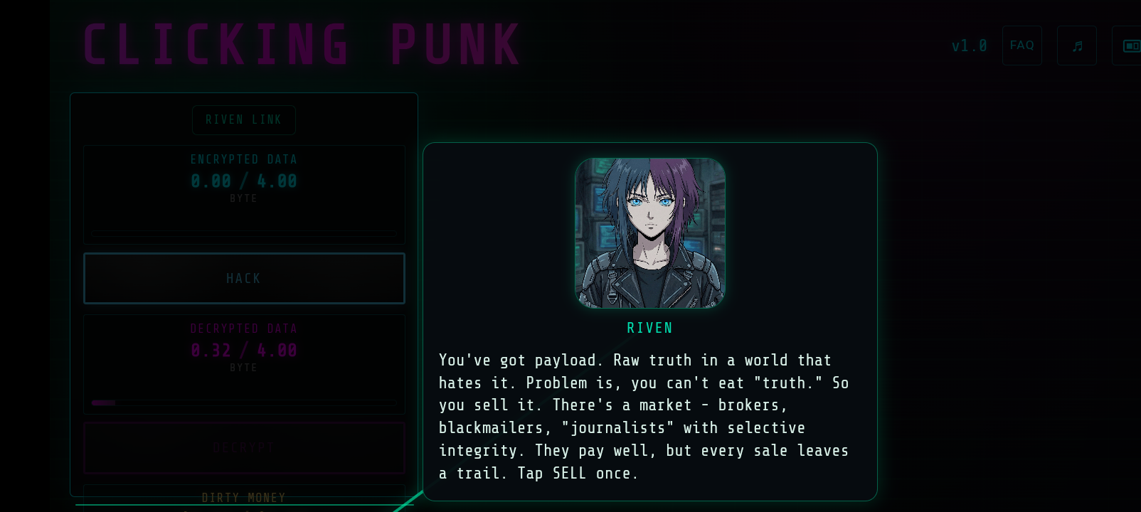 Small quibbles: Once RP are displayed they overlap other text on my phone browser version. The scroll bars are too small to accurately use with a touchpad and there's no click and drag scrolling equivalent, so navigating vertically in menus is a pain. At times the horizontal data for a menu tab exceeded the width of the frame and put up a horizontal scroll bar for that 05% ish of the material. The main menu music ends in a fade, just perceptible dead stop, then restarts with that first relatively hard note, so it doesn't work as looping audio very well. It'd be nice if there were competing focii for our resources or attention, in the current version the next appropriate thing to click always felt super obvious. (There's a little work there in layering things across menu tabs and having different boosters cost from the same cash pool, but the way expenses scale with level make constantly spreading the cash around the obvious choice.)