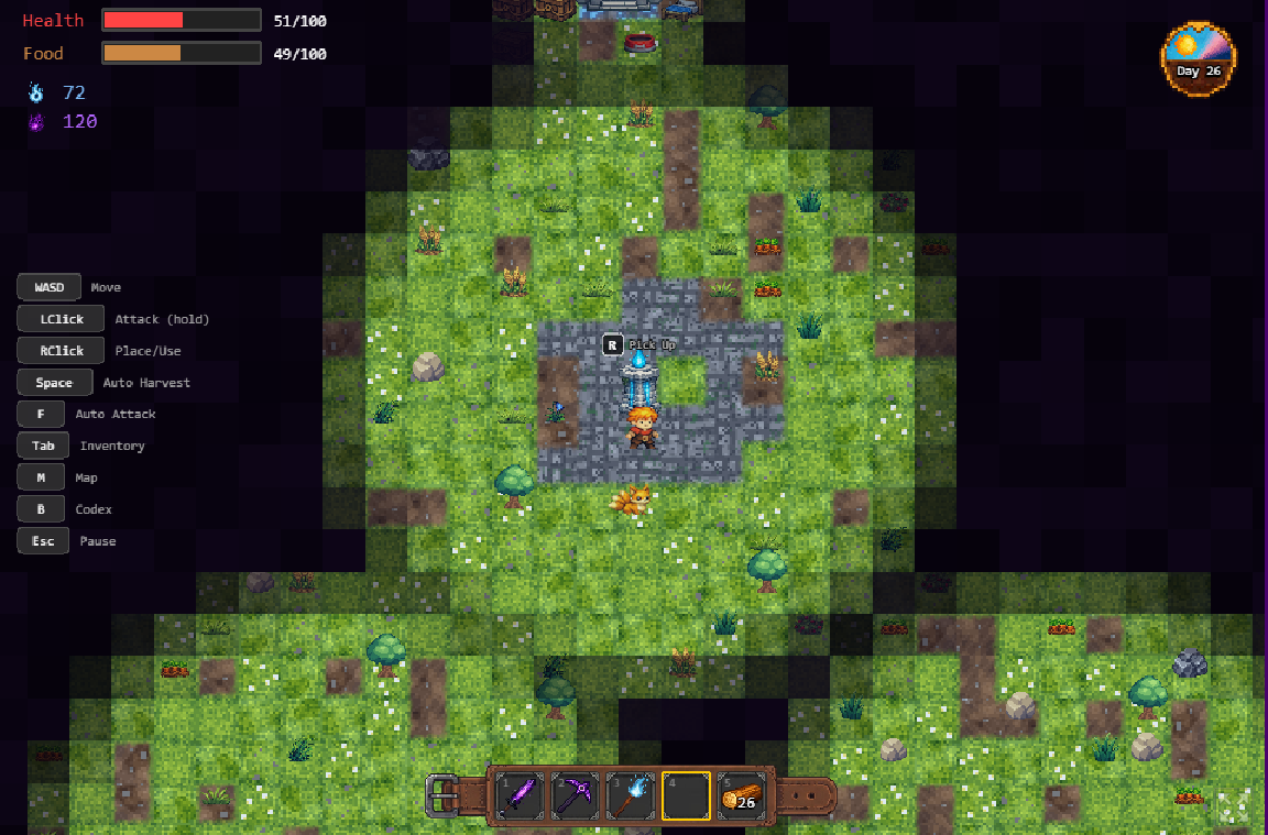 -The first boss I found was this strange tentacle thing? It dropped something called “the Watcher’s Eye”, as well as a magic key! I used the key on my home altar and it turned all purple. Still no idea what the Eye thing does, but it looks cool, so I think that’s worth keeping it around. I also managed to cross the void for the first time!! I used to be able to stand on the patches of grass in the void, but now even those spots cause the void damaging effect. Sorry void base, I’m going to have to let you go. You served me well!