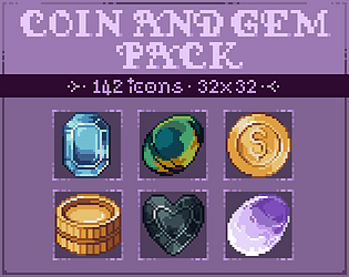 A pixel art icon pack containing a variety of Jewels, Gemstones and Coins.