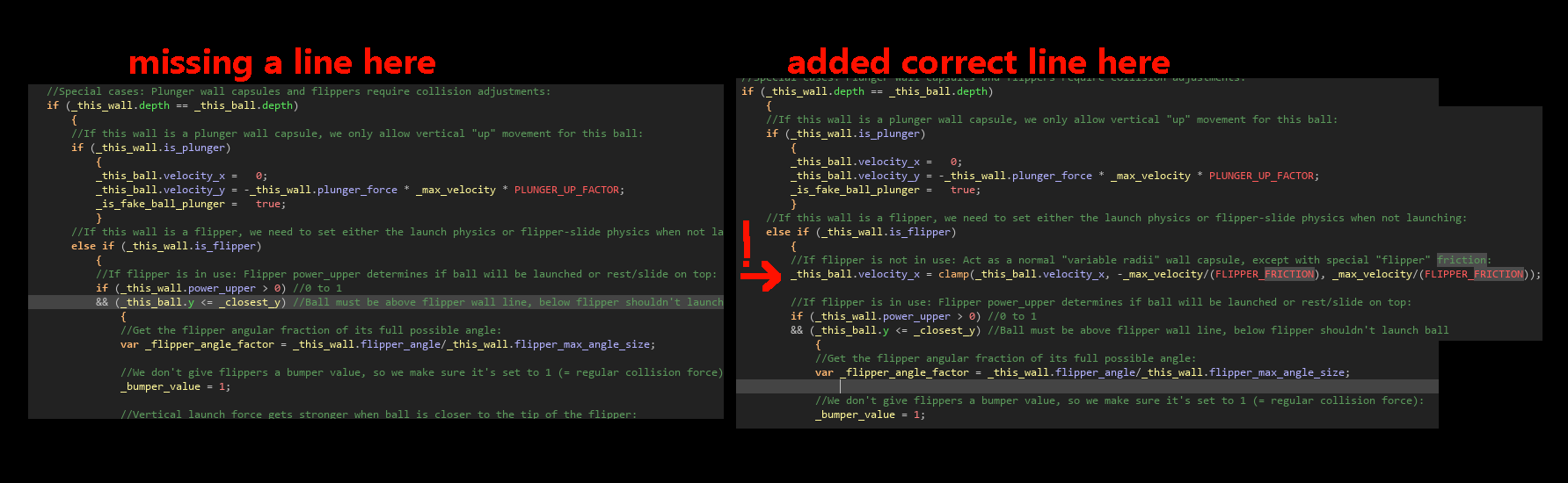Thank you for your feedback! I looked into it and you are right, the flipper friction seems too bouncy, very miniscule and hard to adjust. I've tested it a bit and noticed I forgot to add a line of code in the step event of obj_physics in the current version. I'll make sure to correct that next time I do an update. If I add this line here, the flipper friction becomes a lot easier to adjust using the FLIPPER_FRICTION macro.