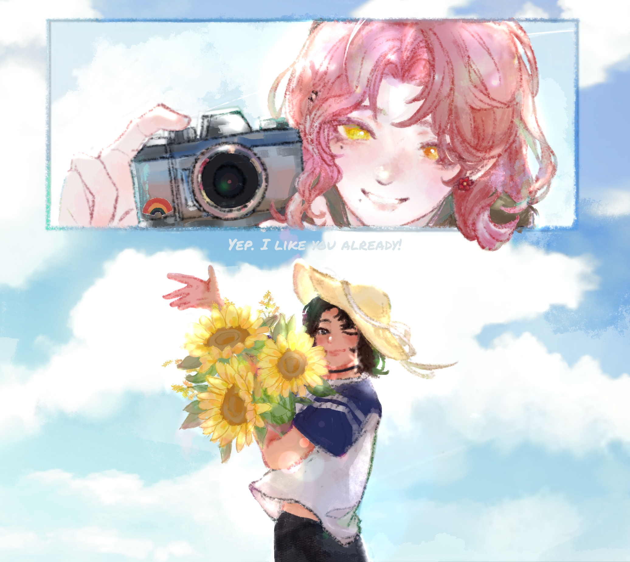 I drew a scene from Step 2 with Step 2 Qiu and my MC, Rose of Sharon. Looking at Qiu under the golden summer sun, Rosasharon felt his heart flutter and fall for them all over again. 😚 (Pose reference by @agabambiyy!)