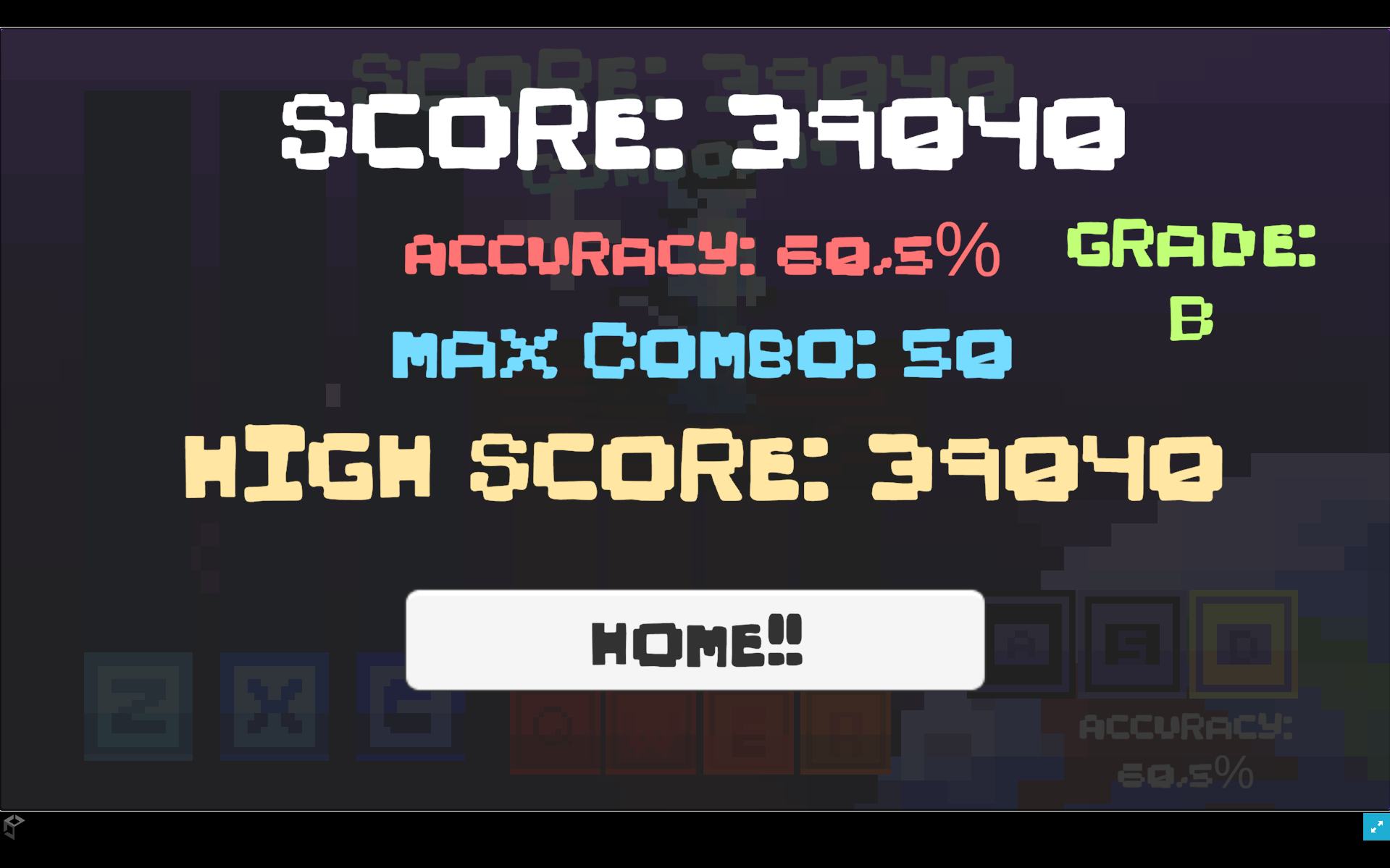 i understand that making an original rhythm game is hard, but this could've done better. the beat map wasn't entirely accurate, i would also change the keybinds to something like ASD FVBH JKL to place 10 fingers and also give some warning to be able to change the set of keys.