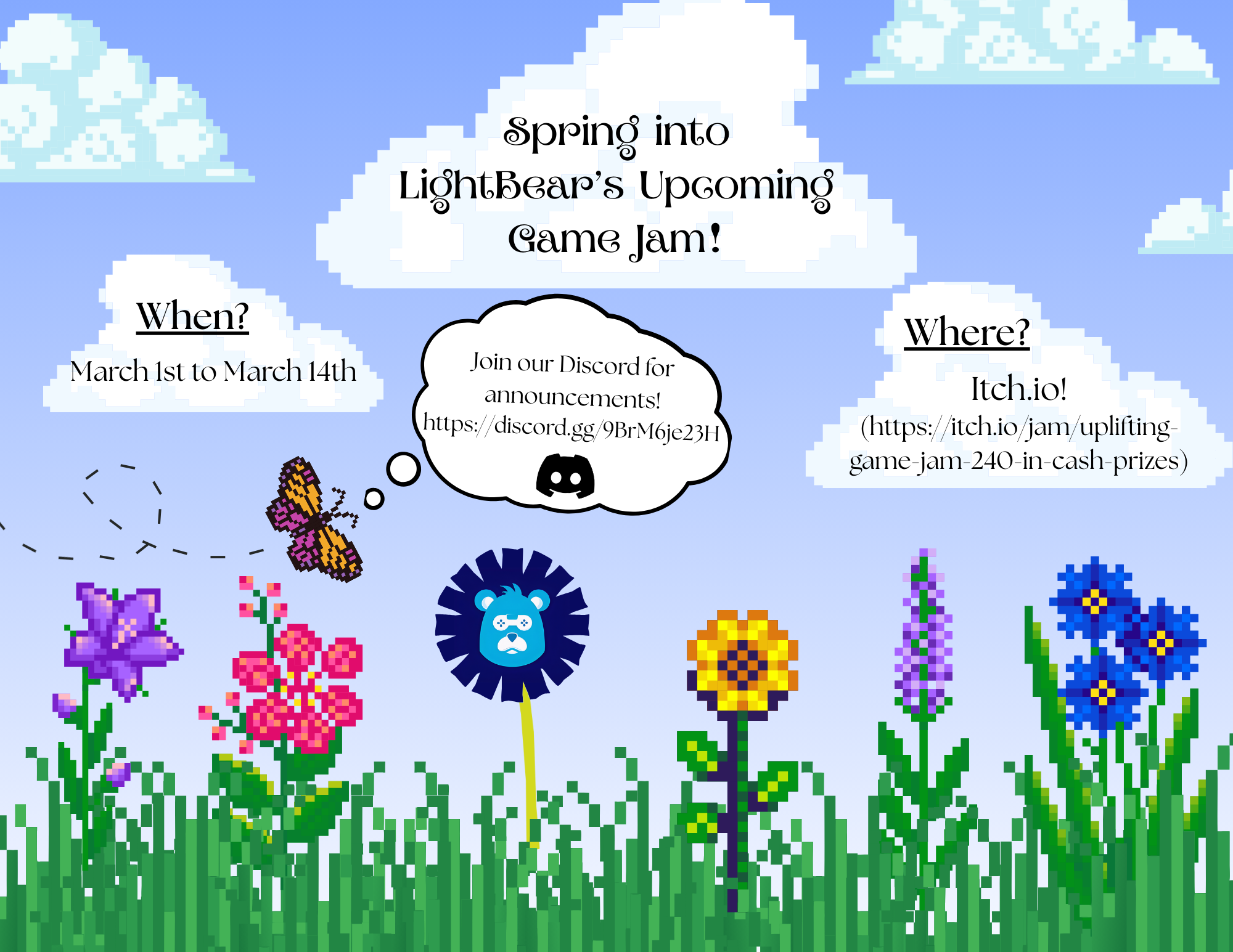 Spring is coming, and with it, LightBear Software's seventh uplifting game jam! What could be better than spending your morning(s glory) making a new game? This game jam has $315 in cash prizes, as well as 1-year CraftPix memberships for those who place in the top five! Submissions open on March 1st, and will remain open until March 14th. If you are interested in joining our upcoming game jam, you can March on over to our game jam page on itch.io: https://itch.io/jam/uplifting-game-jam-240-in-cash-prizes (or just click the graphic above!)