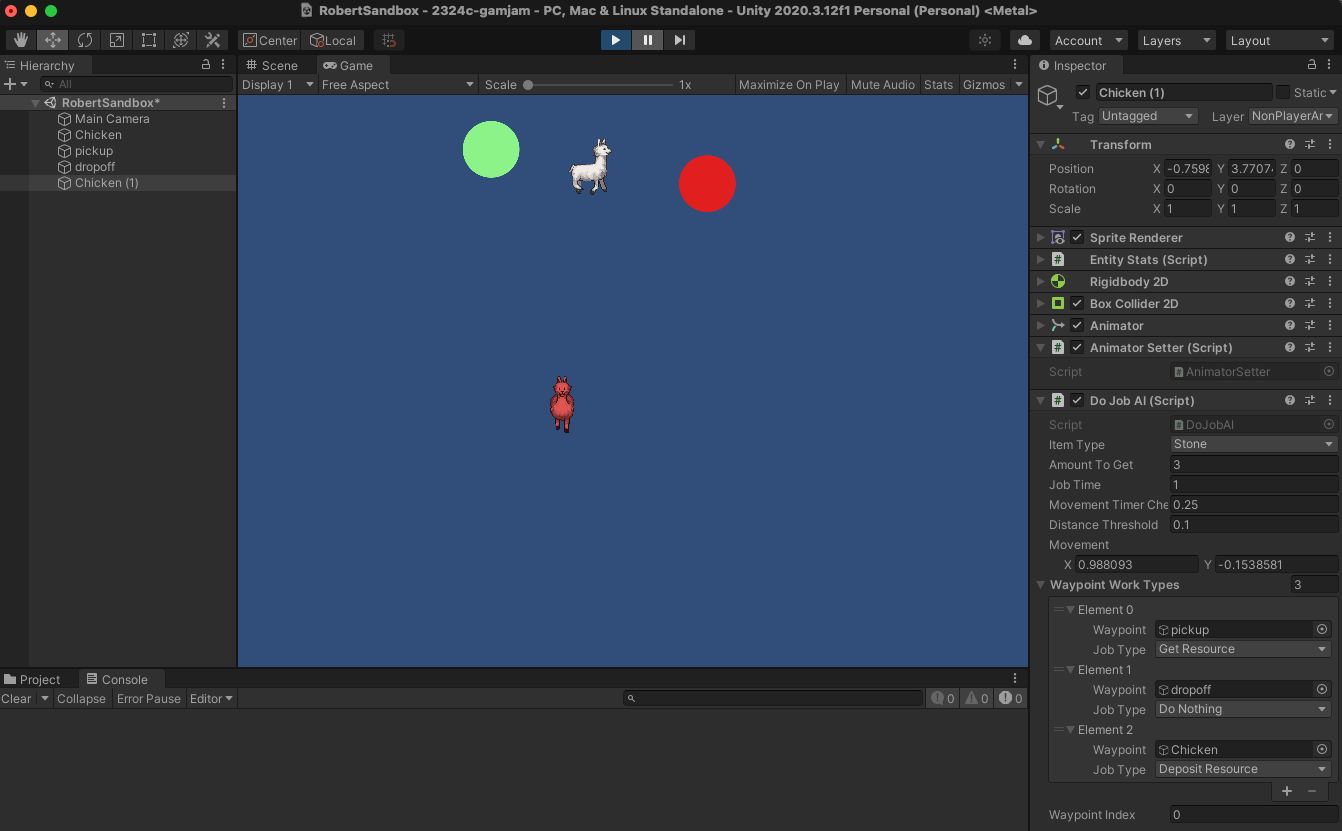I just built the system for setting animal tasks, seen below. The while chicken (ignore the sprite) has been assigned a job to go to the green spot, pick up stones, walk to the red spot, then chase down the red chicken (again, ignore the sprite) to give it the stones, then repeat. The WaypointWorkTypes array on the right is an array of structs that lets me build arbitrarily long work chains for the animals!