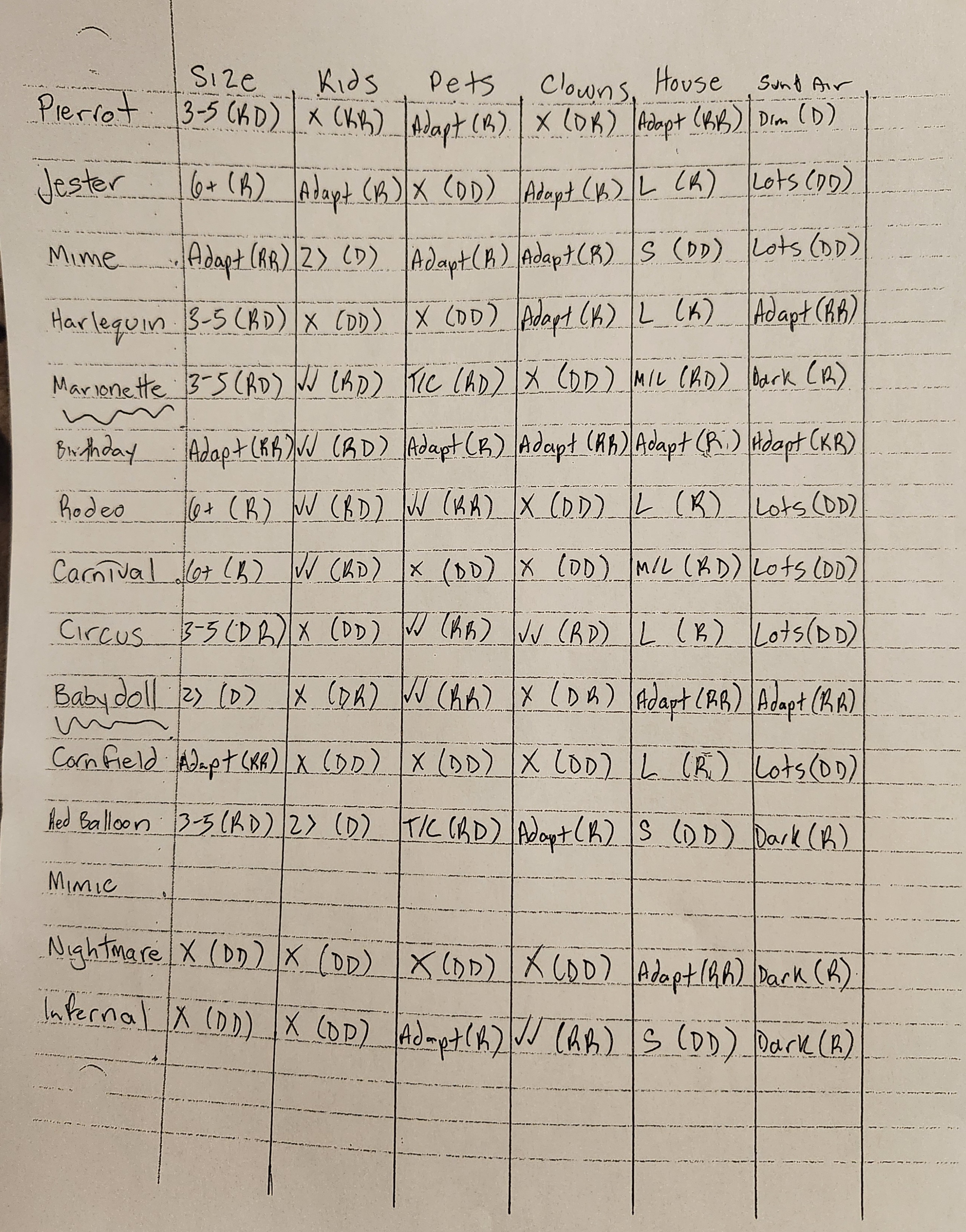Thanks for getting back so fast! Good to know I wasn't missing anything. I have absolutely played a few times through and MAY be neurotic enough to have actually written out a physical sheet table with all the clown types and their family compatibility to make it easier for myself not having to flip through the books.
