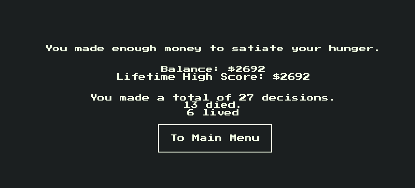 I love gambling! Especially with peoples lives. Extremely tactile and beautiful, the sounds and visuals were feeding the addiction. Amazing job!
