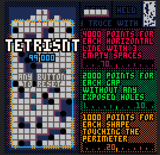 the greenish skin kinda blocks my reading... and the bonus mino on it might need some design to let the player read what color it is (played 5 games, passed marathon at level11, still no clue which color's bonus mino looks like what). for example, i think icon like [< >] [<·>] (the arrowhead may poke out of the mino, with 1px black border) for this skin would be better. or use “回”like skin and stick with arrow with a bar?