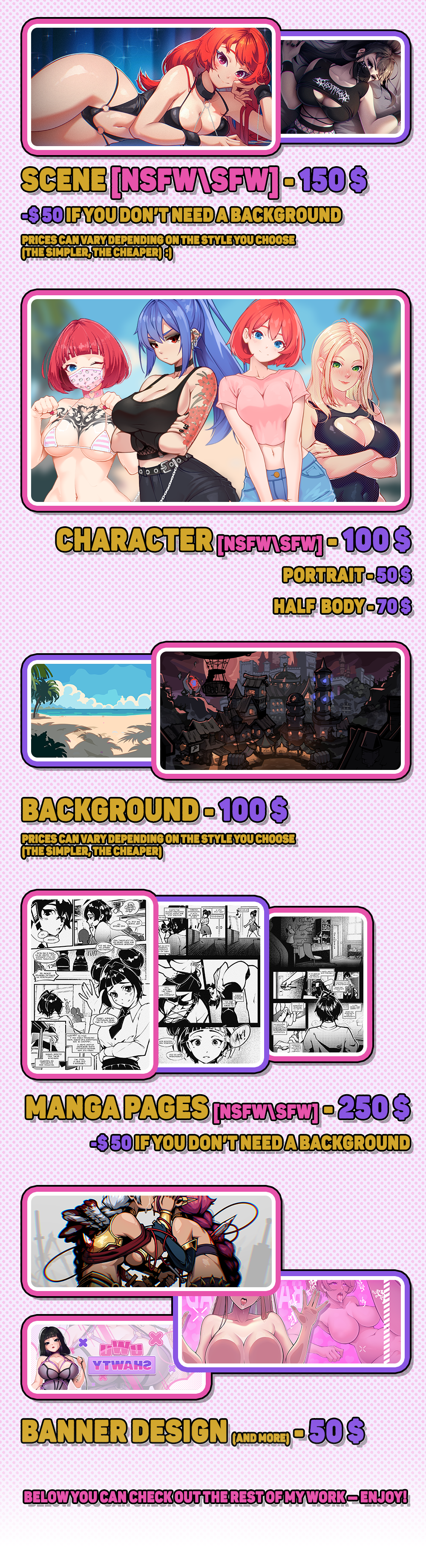 - I'm open to small projects (though I'm definitely up for discussing long-term collaboration as well) and one-time commissions. I'm currently working as an artist on the game Overlewd (by the way, you should totally check it out — it's an awesome game!)