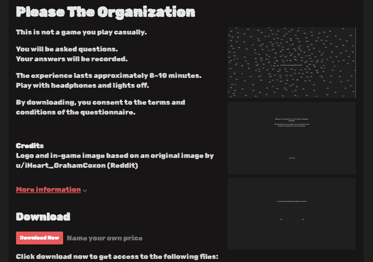Hey all! I just released my first finished game. It's a horror questionnaire game called Please The Organization. My inspiration for this was Fear Assessment by ALEXANDER WISEMAN. It's a short psychological atmospheric horror experience (around 8-10 minutes). I can't say too much without spoiling the game. I'd really appreciate it if you played and reviewed it! I'm looking to get honest feedback on it being my first game, so I can improve in next releases.