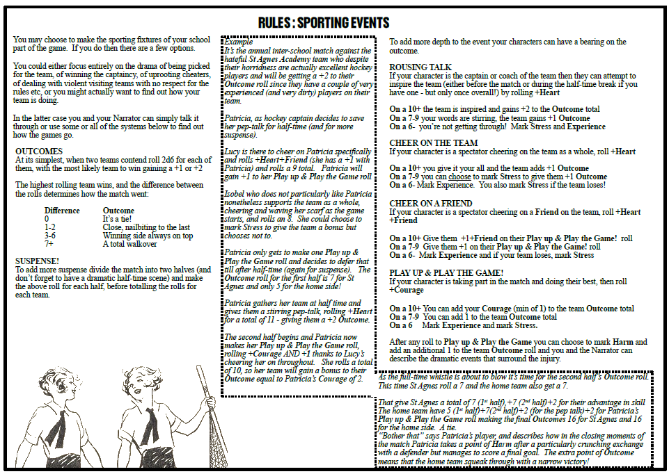 I've just uploaded my first ever attempt at publishing a tabletop rpg (I've been playing and tinkering with them since the early 80s but only for my own groups). This is a cosy-ish rpg using the Powered by the Apocalypse engine, and set in the world of Enid Blyton style post-war boarding schools. It's pretty much complete but I will no doubt keep tinkering in response to feedback and my own obsessive nature and will update devlogs as and when I do. It's PWYW so feel free to check it out.