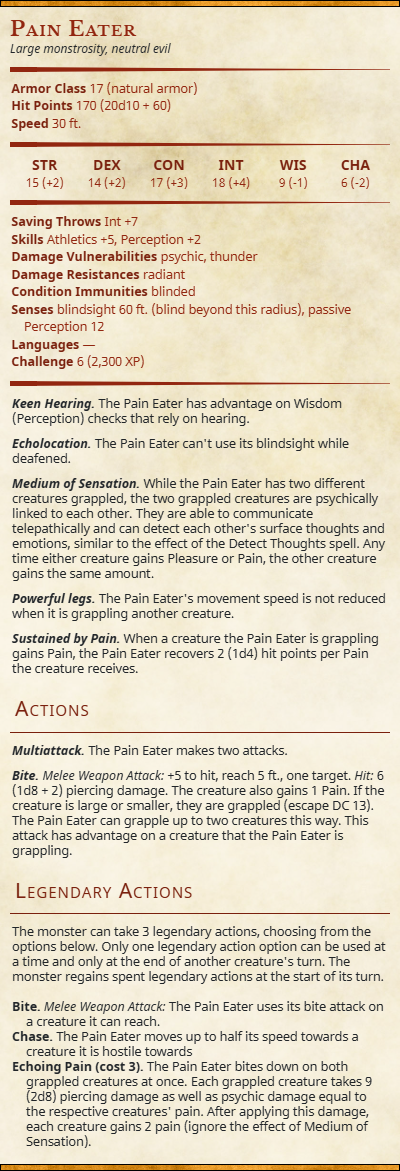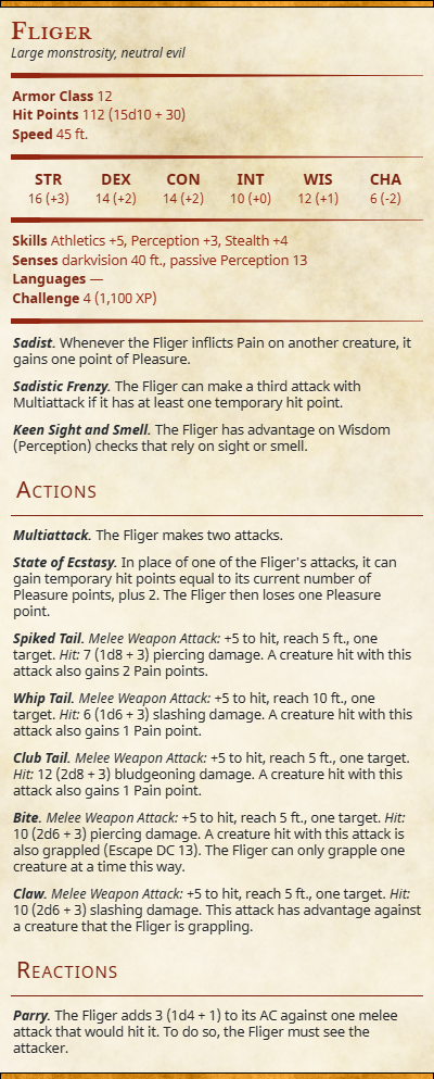 The Fliger is a large, tiger-like monstrosity that likes to abduct individual creatures and carry them off to a secluded lair, where it takes sadistic pleasure in dealing as much pain on the victim until its body or mind gives out. It has three lashing tails, each tipped with a different painful implement.