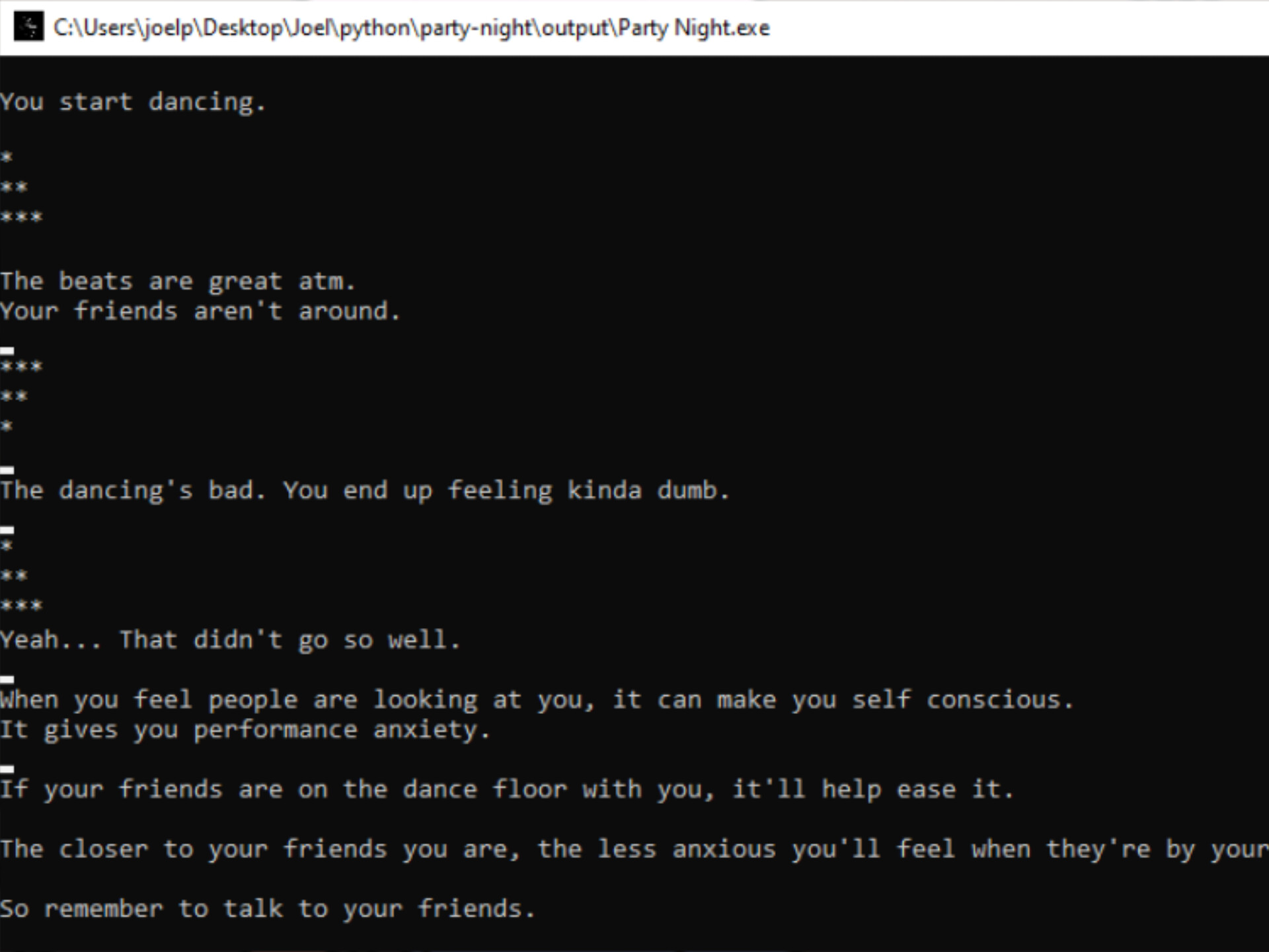 itch.io Community » General » Release Announcements · Created a new topic Party Night - Text based/gender-neutral language, survive a terrible party with the power of friendship and mood enhancers.