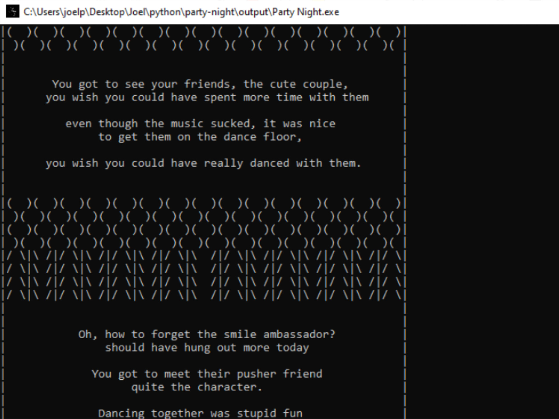 Gender neutral language text game, overcome a terrible party with the power of friendship and mood enhancers.