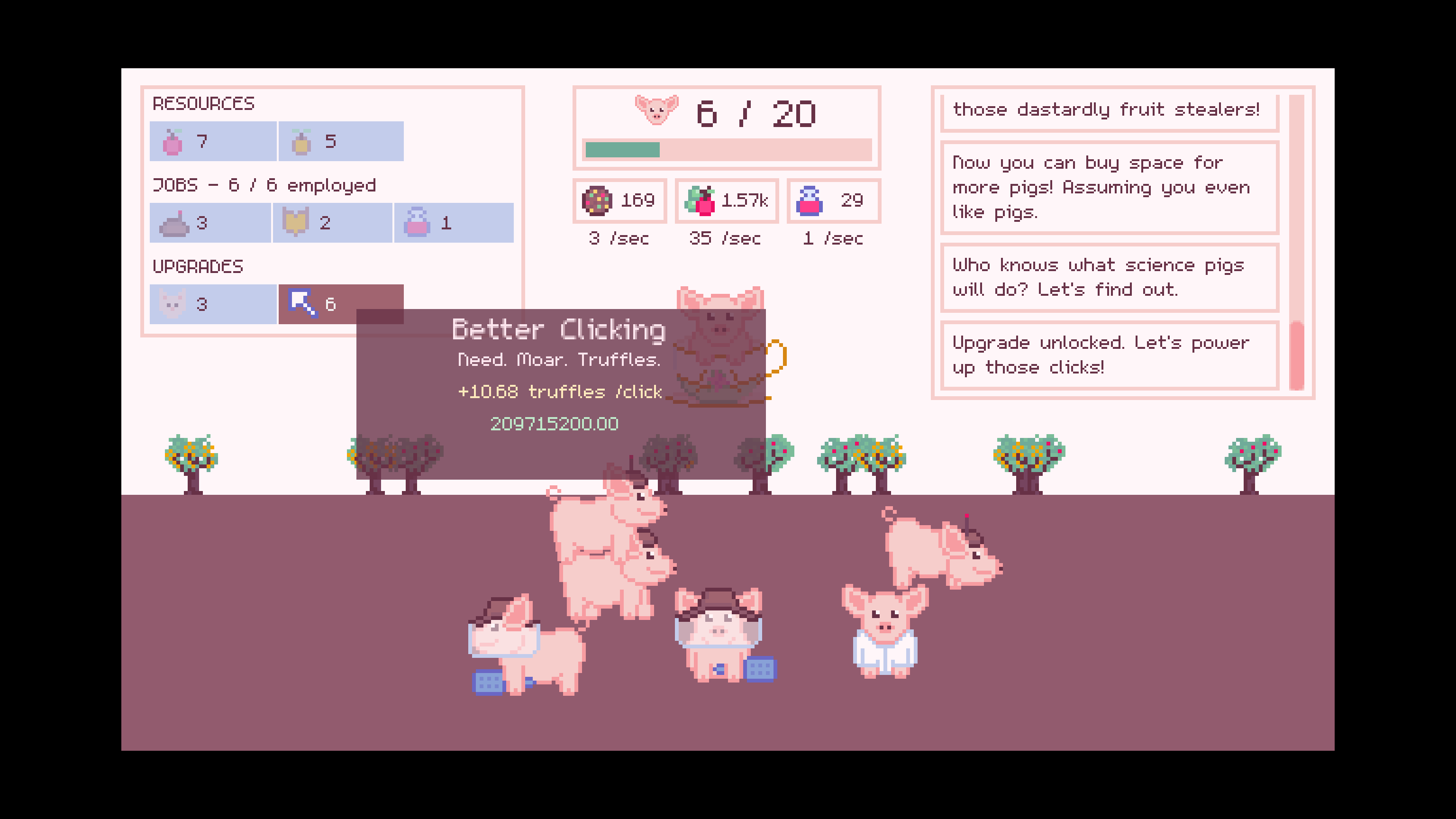 Not bad! I am unfortunately not a fan of idle clicker games. But this one isn't bad, even though it can't entertain for a longer time. The game also contains some bugs. But I adore the pigs, they're so cute. The music is lovely, too. The mechanics of how you can earn truffles, fruits and science aren't bad. Maybe it's a shame that there is no way to use the science. (Or maybe I played too shortly and didn't come to the place? I stopped with 7 pigs.) Well done, overall!