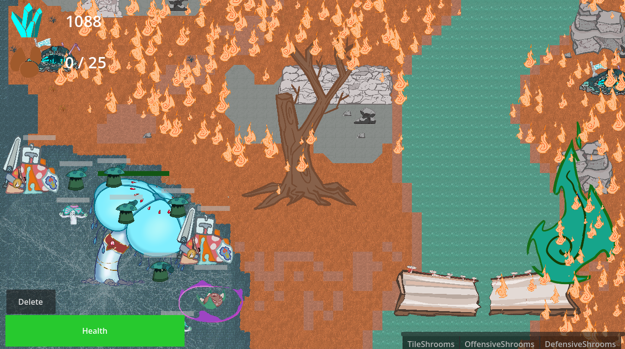 I couldn't run the web version, so I launched the desktop version. I couldn't figure out the game—where the enemies are and how to fight them. I can hear that something is happening and the health bar of my mushrooms is going down, but I don't understand if they're doing anything themselves. Also, I wasn't sure if it's a bug and I just can't see the enemies, or if the enemy is actually the fire? I liked the music and sounds.