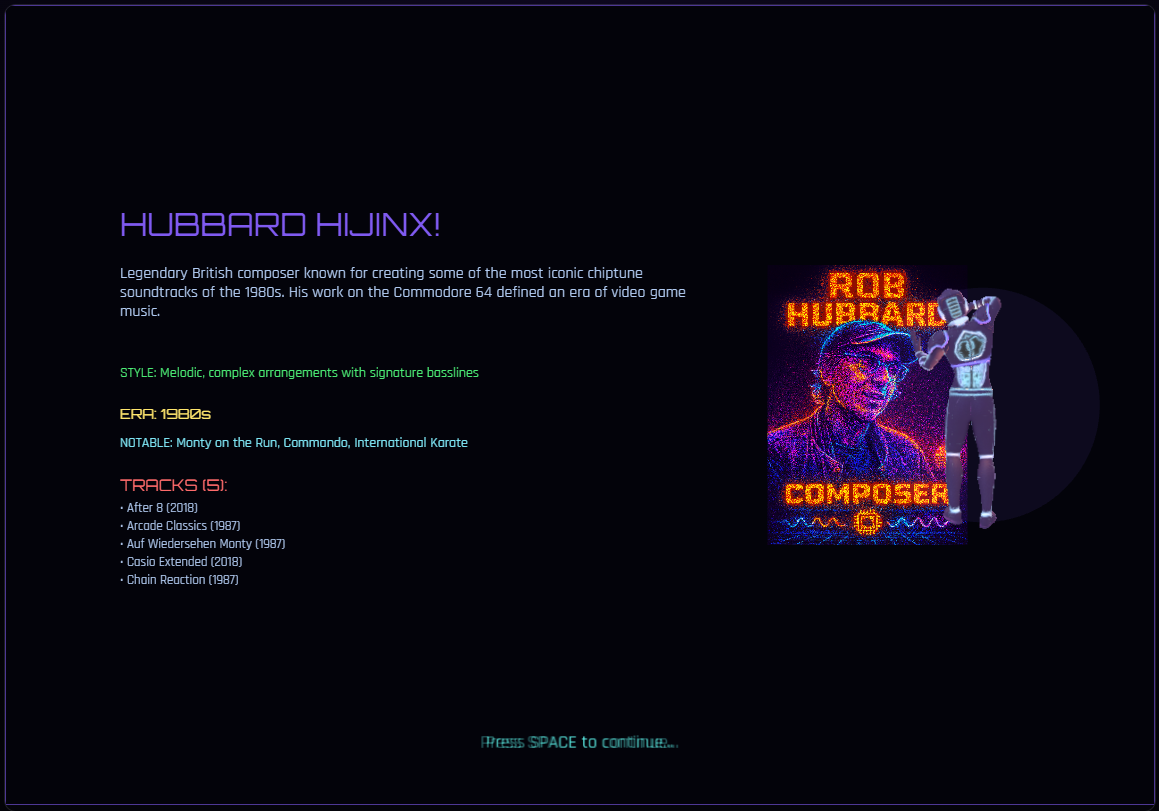 - Authentic C64 SID Music - Powered by Tiny’R’Sid WebAssembly for real SID chip emulation