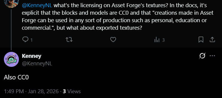 Asset Forge community » Meta » Support · Created a new topic Kenney confirmed that AF's textures are also CC0, yay!