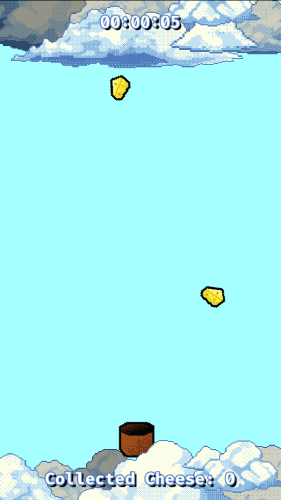 This is a little cozy, relaxing game where you move a bucket around to catch falling cheese. There are no time limits, no score limits. Just you, your time, and your keyboard to see how much cheese you can collect. There is a score and timer shown to show you how long you've been playing and how much cheese you've collected.