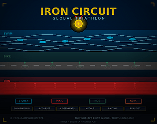IRON CIRCUIT is a rhythm-based triathlon game with real distances from four of the most iconic courses on the planet — Sydney, Tokyo, Nice, and Kona. You tap in rhythm to swim, pedal, and stride. You manage your energy across three disciplines. You race against 7 AI opponents who each have their own strategy.