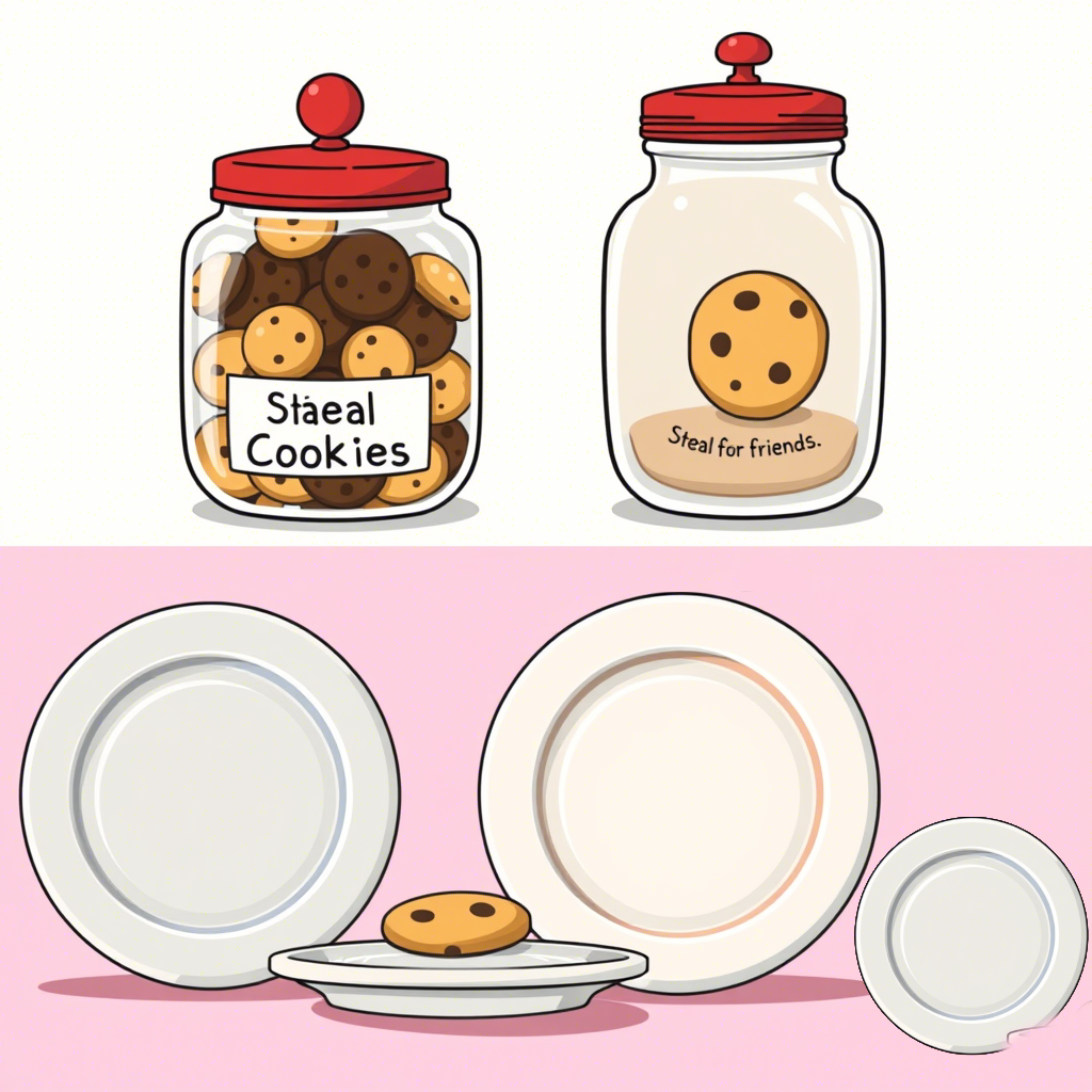 half top part of screen shows 2 cookie jars, the jar on left has full filled with Cookies and Label: Steal Cookies and other jar on right has only 2 cookies with Label: Steal for friends. On other half bottom part of screen are 4 flipped plates on front in a raw in rotation motion