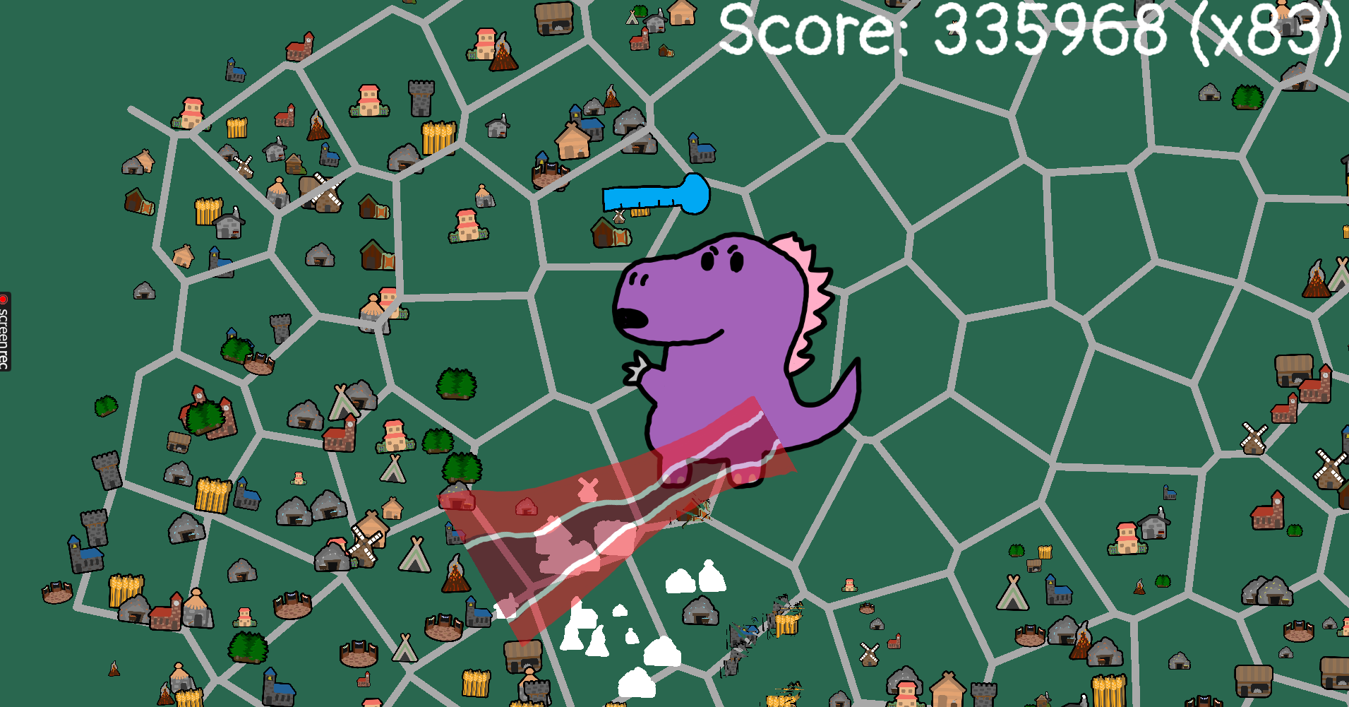 Nice game! I really enjoyed how the dinosaur got bigger, and the camera zoomed out accordingly. The surprise when I discovered my small village was actually HUGE was really fun. The one improvement I can think of right now would be changing the attack animation. The slash looks a little odd, and something else, such as a bite animation, would enhance the dino theme.