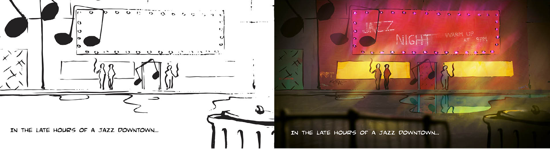 Black and white lines and basic color selection are done by the 2D artist and you would do the color atmosphere, ambient lights and blurred areas.