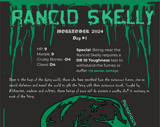 Deep in the bogs of the dying world, those who have perished from the poisonous fumes, rise as rancid skeletons and travel the world to gift the living with their poisonous touch. Sought by Alchemists, madmen and cultists, these beings of pure evil do possess a worthy skull in contrary to most of the living. https://gathgar.itch.io/the-rancid-skelly