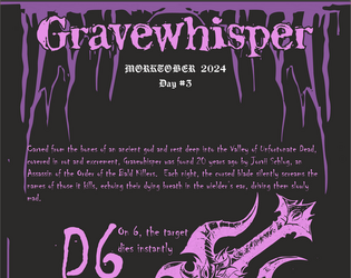 Carved from the bones of an ancient god and rest deep into the Valley of Unfortunate Dead, covered in rot and excrement, Gravewhisper was found 20 years ago by Jorvii Schlug, an Assassin of the Order of the Bald Killers. Each night, the cursed blade silently screams the names of those it kills, echoing their dying breath in the wielder’s ear, driving them slowly mad.