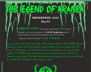 Eons ago, Aranea, the Spider Loa of the Sarkash Woods excreted her vilest VENOM. Anyone who came in contact with it and survived, acquired prophetic powers and spider senses. Of course HE paid Aranea a visit and killed her because the World was in no need of another prophet. The VENOM however continues to get excreted from the corpse of Aranea. It happens on every solstice. The legend draws madmen and doomsayers to her corpse who decide to end their lives. A handful of them manage to survive.