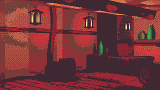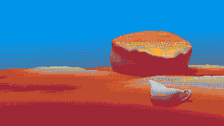 Yo! Artist for the submission here, this style of graphics is actually super quick to make! First block it out in blender, I used the ocean modifier for the gravy sea. Dumb down the export resolution, then import into Aseprite. Aseprite has a really cool function for indexing the colors, so all you have to do is load ur palette, then go to sprite -> color mode -> more options and you can choose the level of dithering.