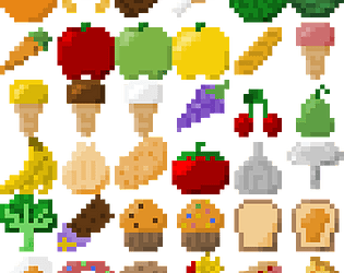 A collection of pixel art food items featuring a variety of tasty eats and treats.