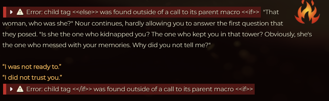 Hey, I absolutely love how this is going! The art is great and the story is so interesting, can't wait to see more! But, there is one problemo.... the image below is what happened after Llith says to ask him questions and stuff after we stand up to him. Besides this, the game is really good, and I can't wait to see what happens next!