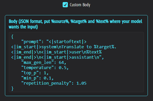"prompt": "<|startoftext|><|im_start|>system\nTranslate to %target%.<|im_end|>\n<|im_start|>user\n%text%<|im_end|>\n<|im_start|>assistant\n",