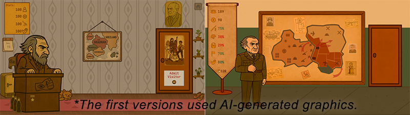 It all started with browser versions (later released on Google Play) of Dictator Simulator: 1984. After that, I released the sequel War Simulator: 1985. Both games received a huge number of reviews — over 500. I tried to take this feedback into account and create a full-fledged game that would combine the story of the first games and feature original artwork without using AI.