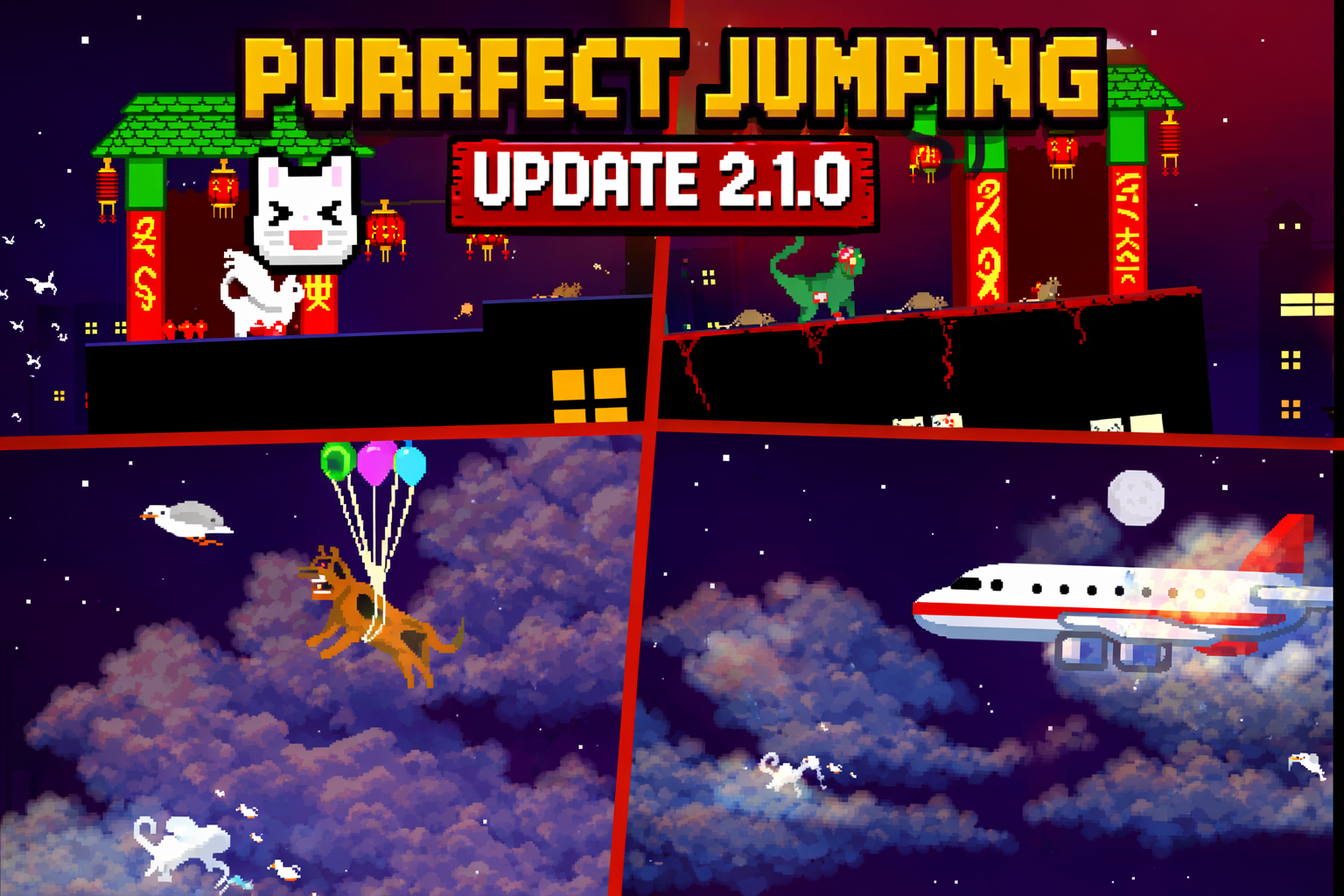 Purrfect jumping is an endless runner where the aim is to jump across buildings catching mice and birds while avoiding dogs and gaps.