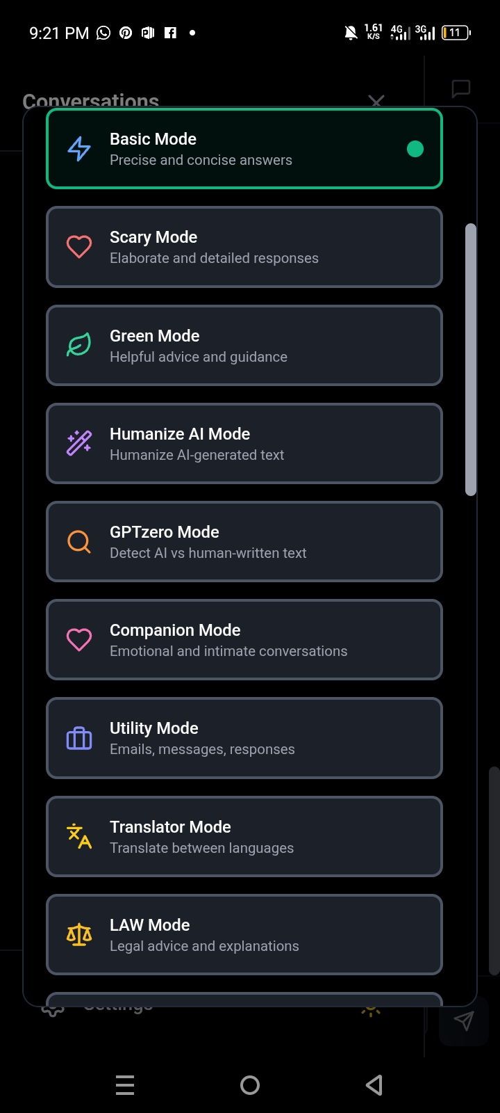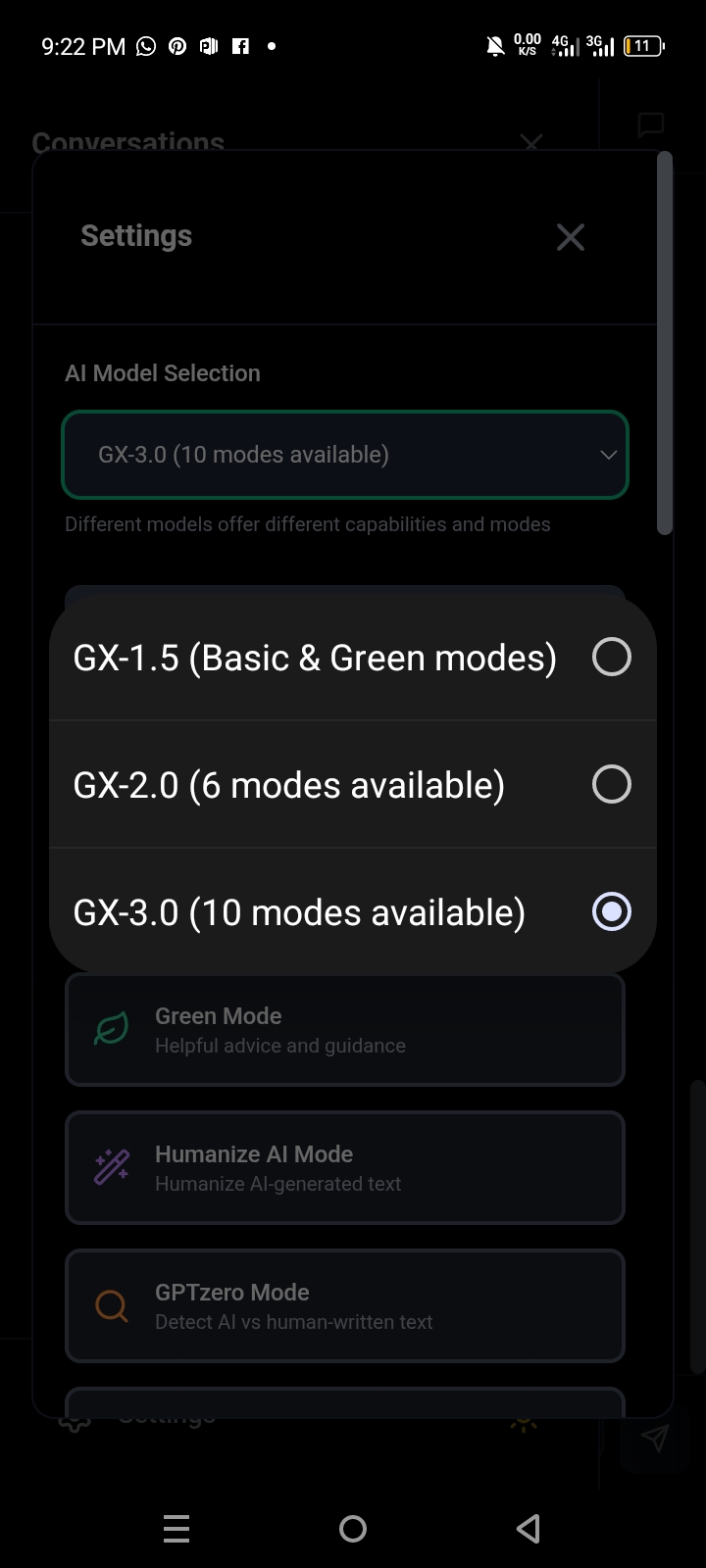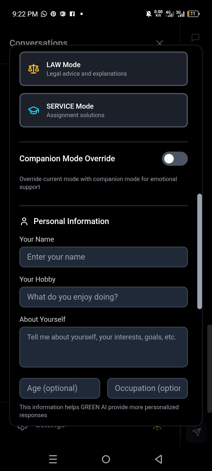 We've updated Green AI 3.0 and added some cool features that are mind-blowing like the Humanize AI, that humanizes AI written content to prevent detection by GPTs, we've also added GPTzero as a mode that detects AI written content, we've added companion mode that enables GREEN AI act like a partner and also utility mode that enables GREEN AI write emails and do more and we've also added translate mode and also the service mode that makes AI do assignments, and also Law mode that makes AI specialize on law alone and also you can customize GREEN AI to know you as a person by stating your hobbies and also you can change Green AI modes to adapt to a particular language settings.