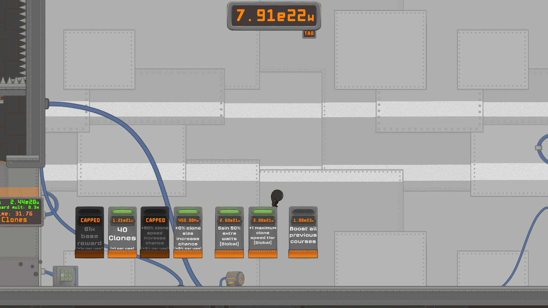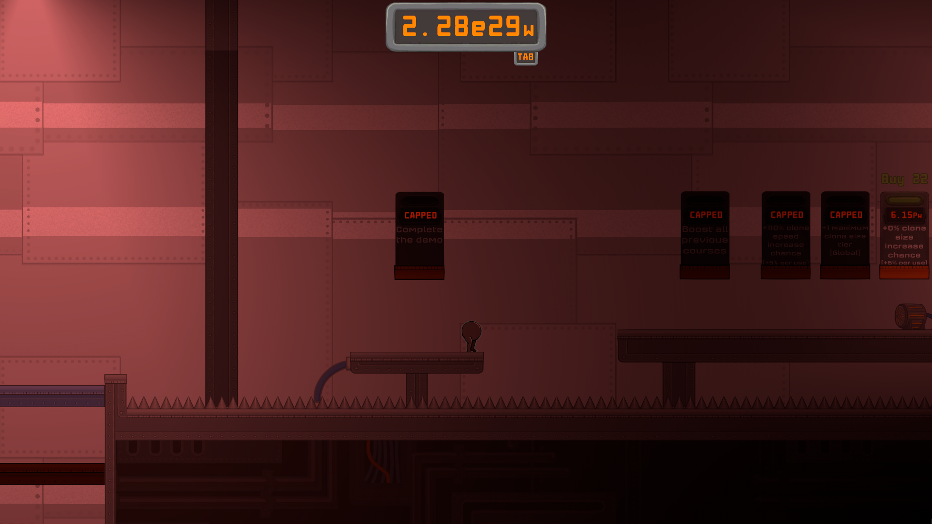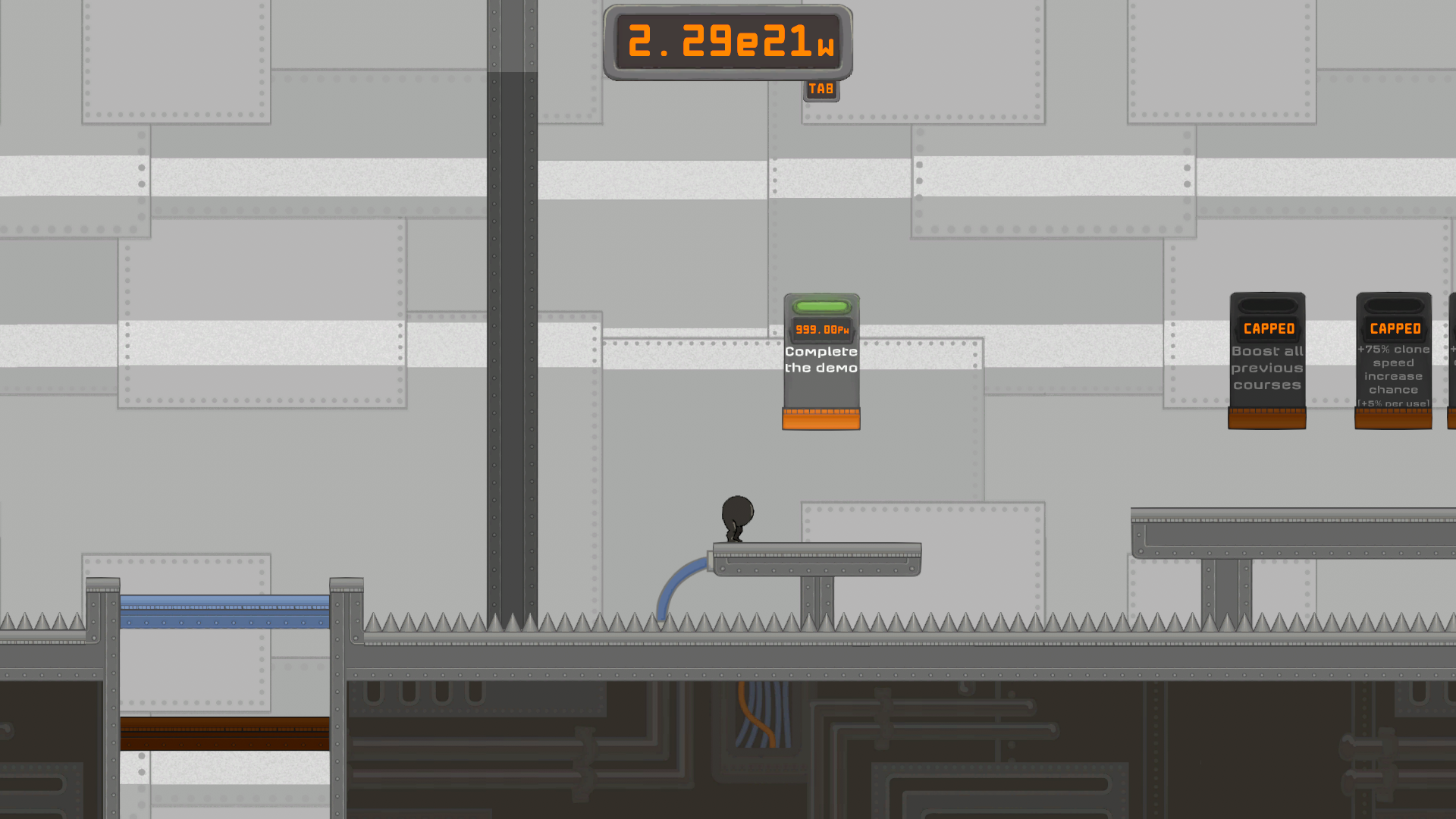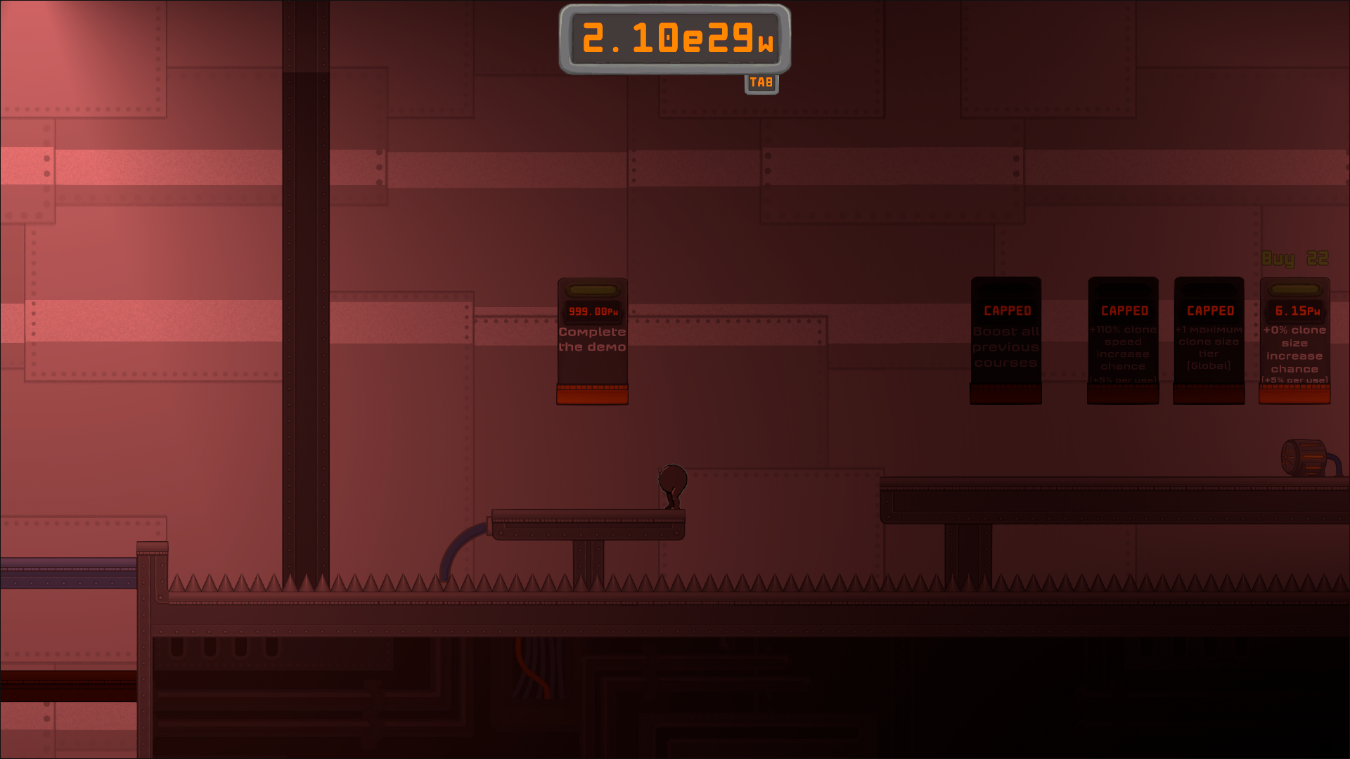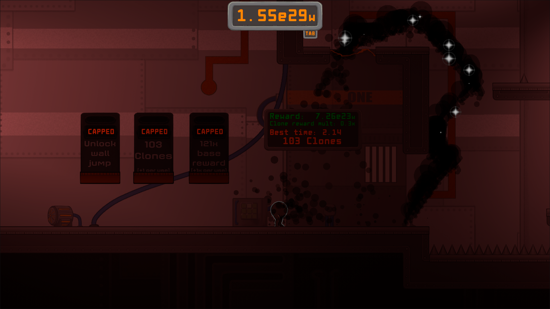 Short game, but certainly a lot of fun. The first thing I tried was seeing if you could stack bombs for bigger jumps, which I see actually is a required mechanic partway through "Spike Hell", which is nice. Makes speedrunning the game a sure possibility. (Also, there's a mechanic where you can fire a rocket off in mid-air to gain momentum opposite to where you shot, but only once before you need to touch the ground again; made skipping parts of Spike Hell quite easy.)