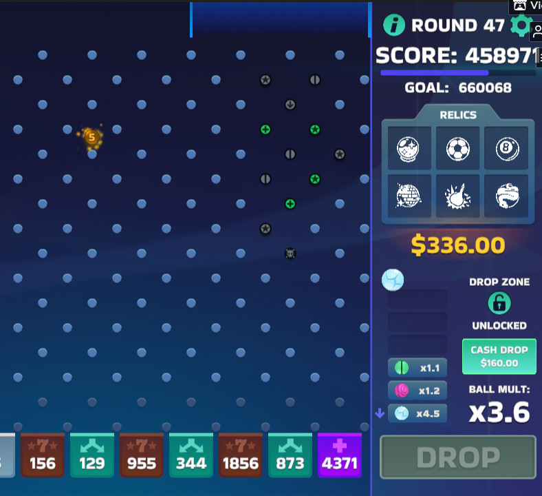 You can see the crystal ball just beneath my cash display. It bounced out to the right. The game doesn't consider this drop to be complete, and so it won't let me begin another drop. I can use cash drop, but the jackpot bins and special pegs don't reset.