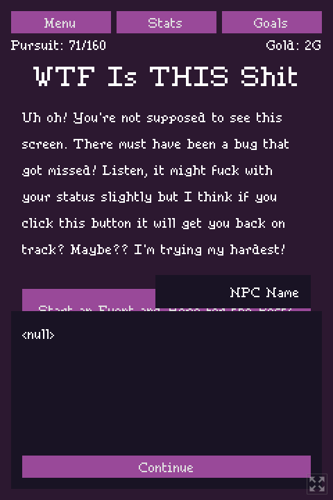 I was really enjoying this! Loved the introduction and was starting to get the hang of the sex system, but as soon as I left the first orgy that "WTF Is THIS Shit" screen appeared behind the actual game screen.