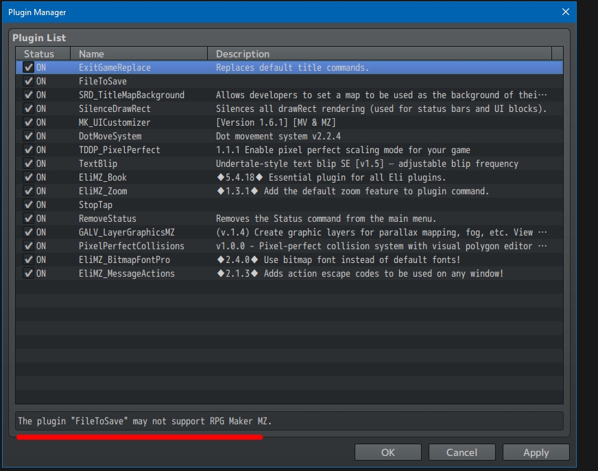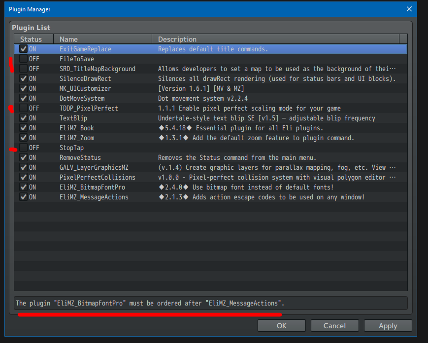 It's best if you keep that warning clear. Because RPG Maker only shopws to you one warning at time. If you keep disabling the plugins that are showing the warning, you will end up on this warning below: