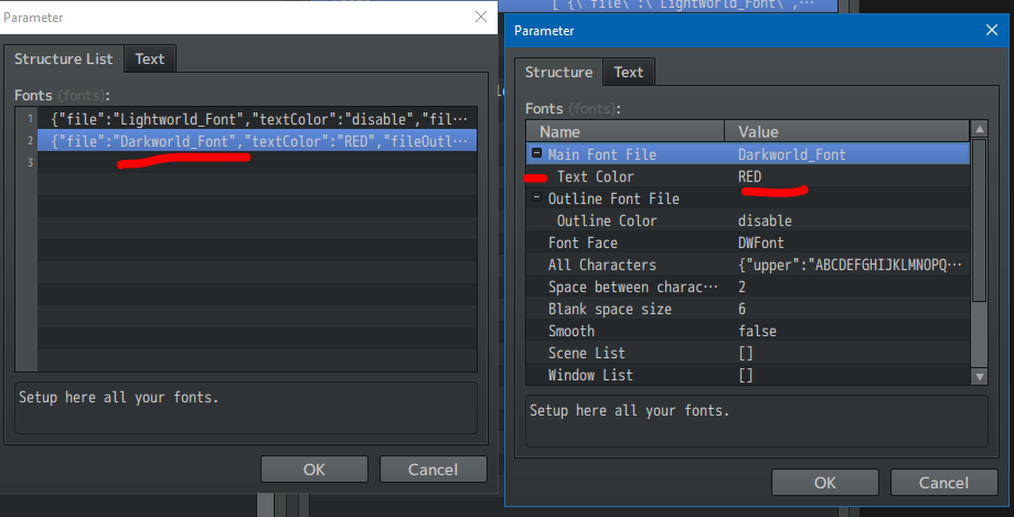 - Each entry on the "Fonts" parameter is a new font that will be available to use. On the screenshot above, you can see that are 3 entries. Means that are 3 available fonts to use inside the game. You just need to create more entries on the "Fonts". You can create as many as you want.