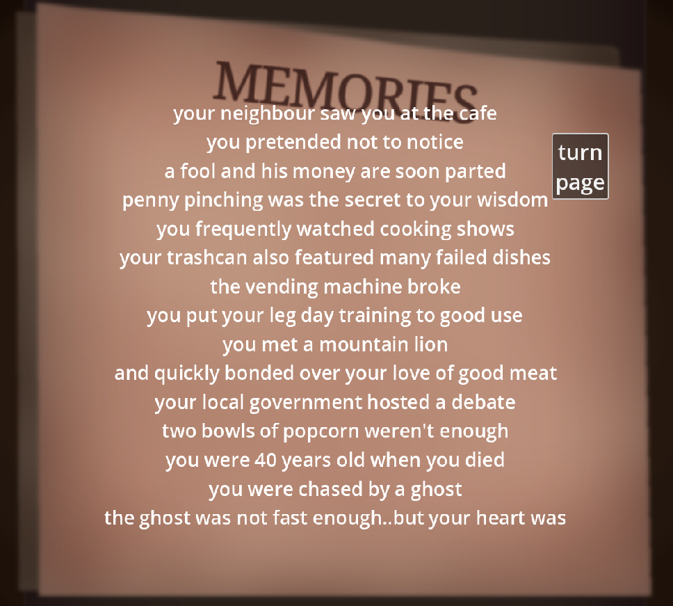 The atmosphere was great, I got scared when the characters hand reached the door, I thought it was a ghost hand reaching in hahah, too bad it ends when you inspect the knife (I tried to play it 3 more times to see a new door opened but didn't find any), but it has great potential, If you update this game I'll definitely play it!