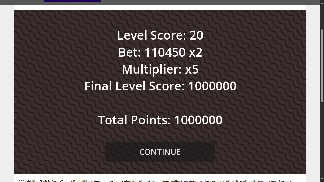 First, the gamble mechanic is easily exploitable so you never feel real risk. You can high the chance of a wrong number to like 10-20 and just play 4 numbers to get lots of cookies easily, and if you get a wrong number, that doesn't matter, you only pay one cookie to play. To fix this, would be cool to have to pay more cookies for more wrong numbers, and also you could make the player lose cookies if they get a wrong number.