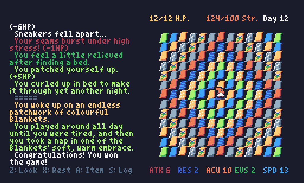 I loved this, delightful. Took me four tries but I got the blanket ending, might go back and also try to get the day 20 ending. Definitely had fun with the learning curve and uncovering the mechanics. The aesthetics and flavour of the game are an utter delight, and I appreciate the Lint Lapins who I'm sure are relatives of Dust Bunnies. :) Quite interesting managing the health and stress stats. I know what the maid hat does but want to go back and explore some of the other equipment options. Wonderful work!