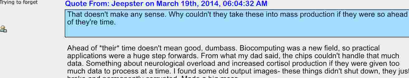 Now, when I was trying to find out exactly what kind of chip this was (which has been hard, a lot of results tend to relate to the similarly titled manga "Beserk"), I did happen across an old forum that discussed the acquisition of Universal Research Laboratories by Stern in the 70s. Unfortunately, this was not related to what I wanted to learn, but it did lead me down a rabbit hole that feels like it might be related! URL was constantly dumping money into R&D (one of the reasons they had to file into bankruptcy), and it was rumored some of the stuff they were working on was pretty ahead of it's time. Advanced language models, a Deep-Blue esq chess supercomputer- and, to my shock, a biocomputing chip. The forum speculated they were using organic material from mice, along with a cocktail of chemicals to keep the material alive, healthy, and capable of interacting with the electronic systems. It was kind of horrifying, honestly! I couldn't stop reading.