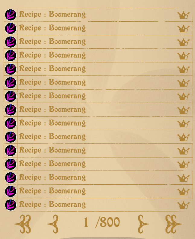 hello, ive been really enjoying this game but I cant craft anything with alchemy because my recipe page is just 800 pages of boomerang and I have no idea why