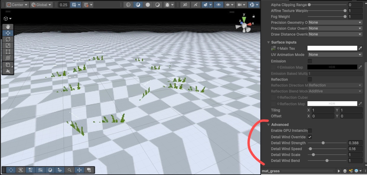 If you enable the Wind override, the shader will use the advanced sliders to control the wind effect directly.