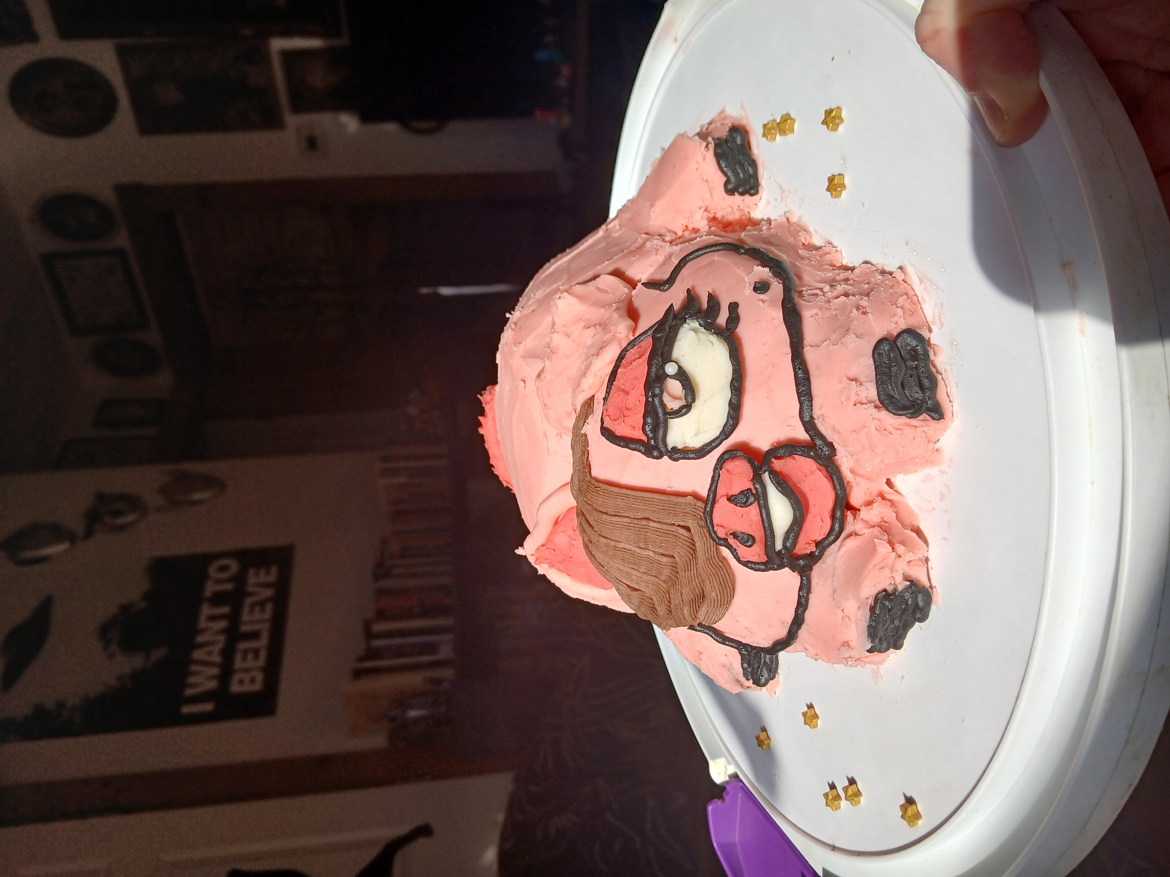 (attached is a photo of my most recent cake, in the shape of me mr pig)